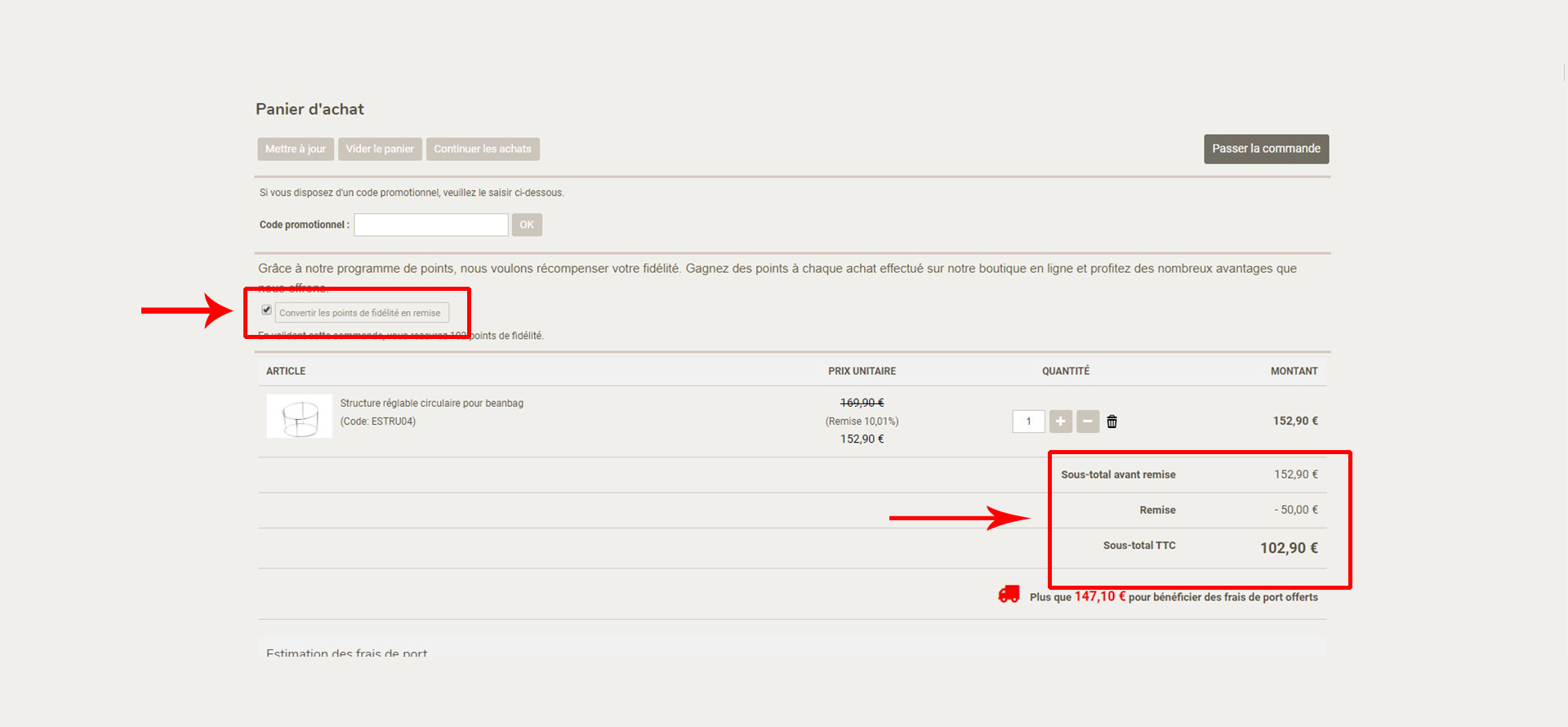 Pour terminer le processus, lorsque vous avez tous les articles dans le panier, vous pouvez voir en haut une case que vous devez cocher pour appliquer la remise de points de fidélité sur cet achat. Si vous cochez cette case, la remise sera appliquée directement sur le total de votre commande.
