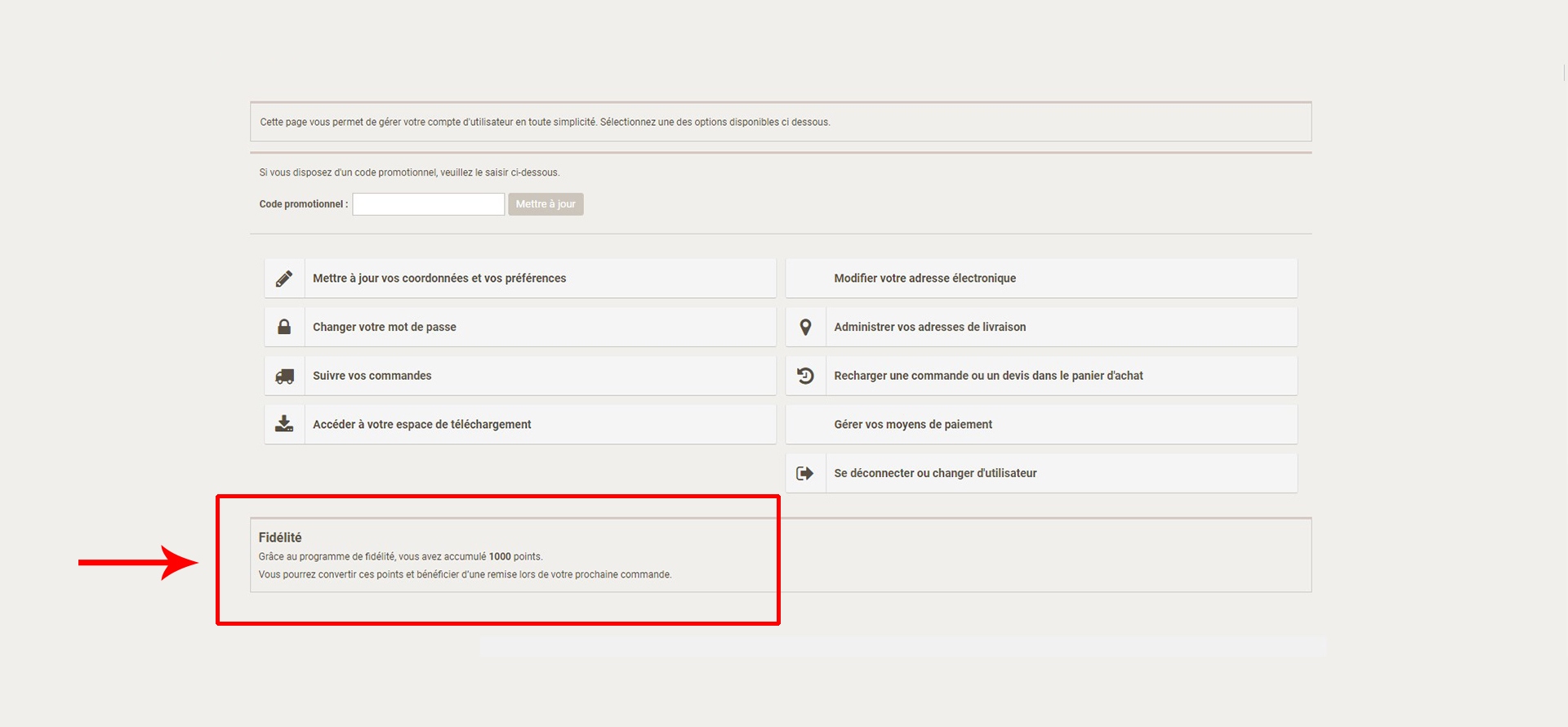 Lorsque vous êtes déjà dans votre compte client, vous pouvez voir combien de points fidélité vous avez à utiliser lors de votre prochain achat :